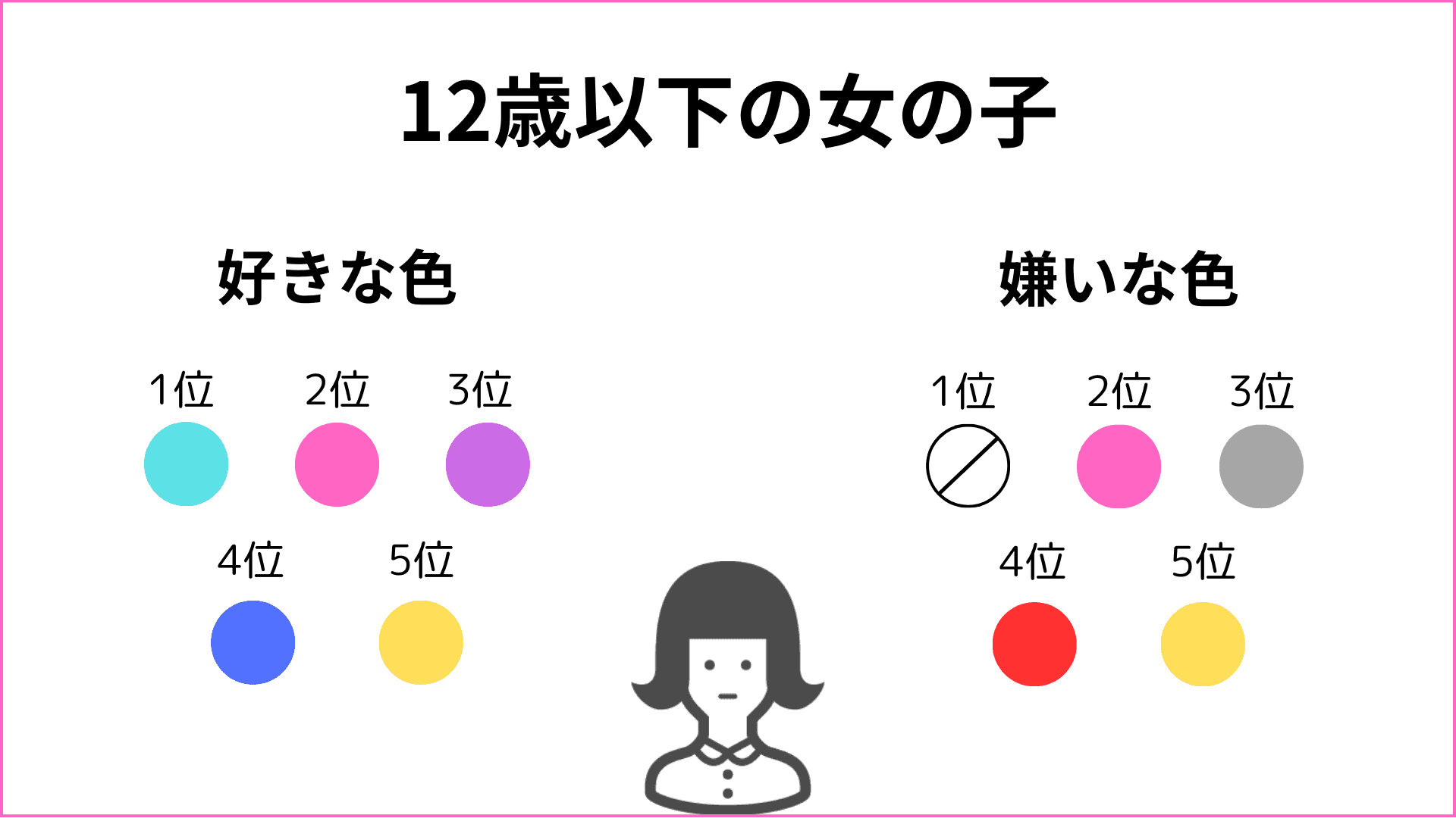 12歳以下の女の子が好きな色と嫌いな色は下記のような結果となっております!