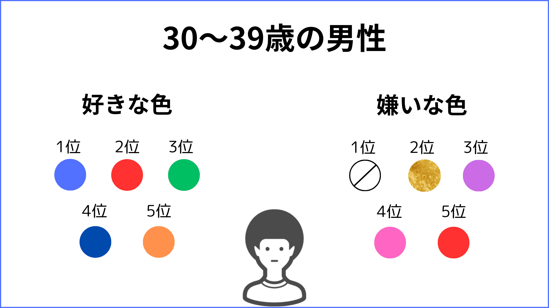 30〜39歳の男性が好きな色と嫌いな色は下記のような結果となっております!