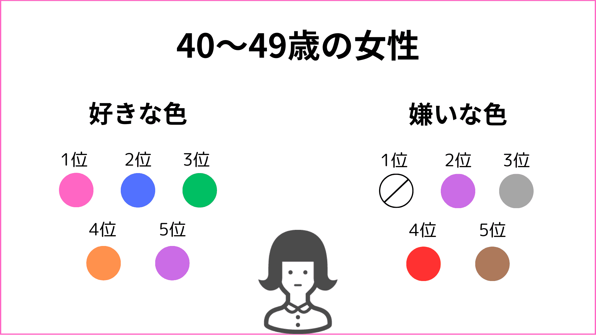 40〜49歳の女性が好きな色と嫌いな色は下記のような結果となっております!