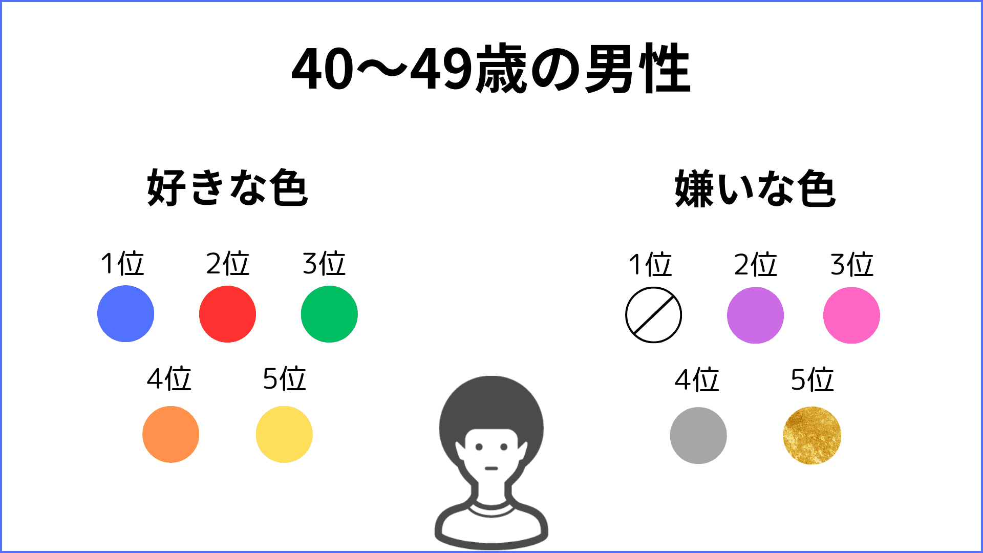 40〜49歳の男性が好きな色と嫌いな色は下記のような結果となっております!