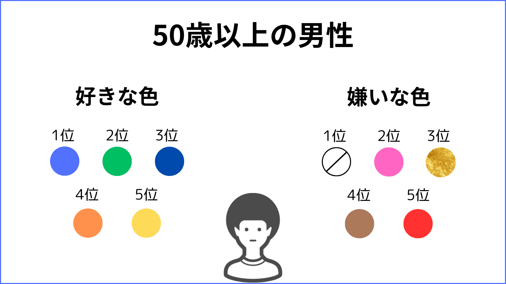 50歳以上の男性が好きな色と嫌いな色は下記のような結果となっております!