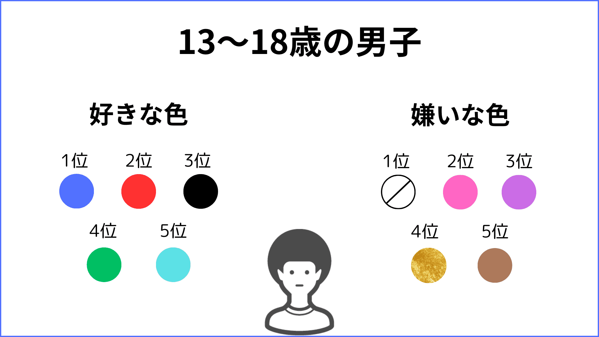 13~18歳の男子が好きな色と嫌いな色は下記のような結果となっております!