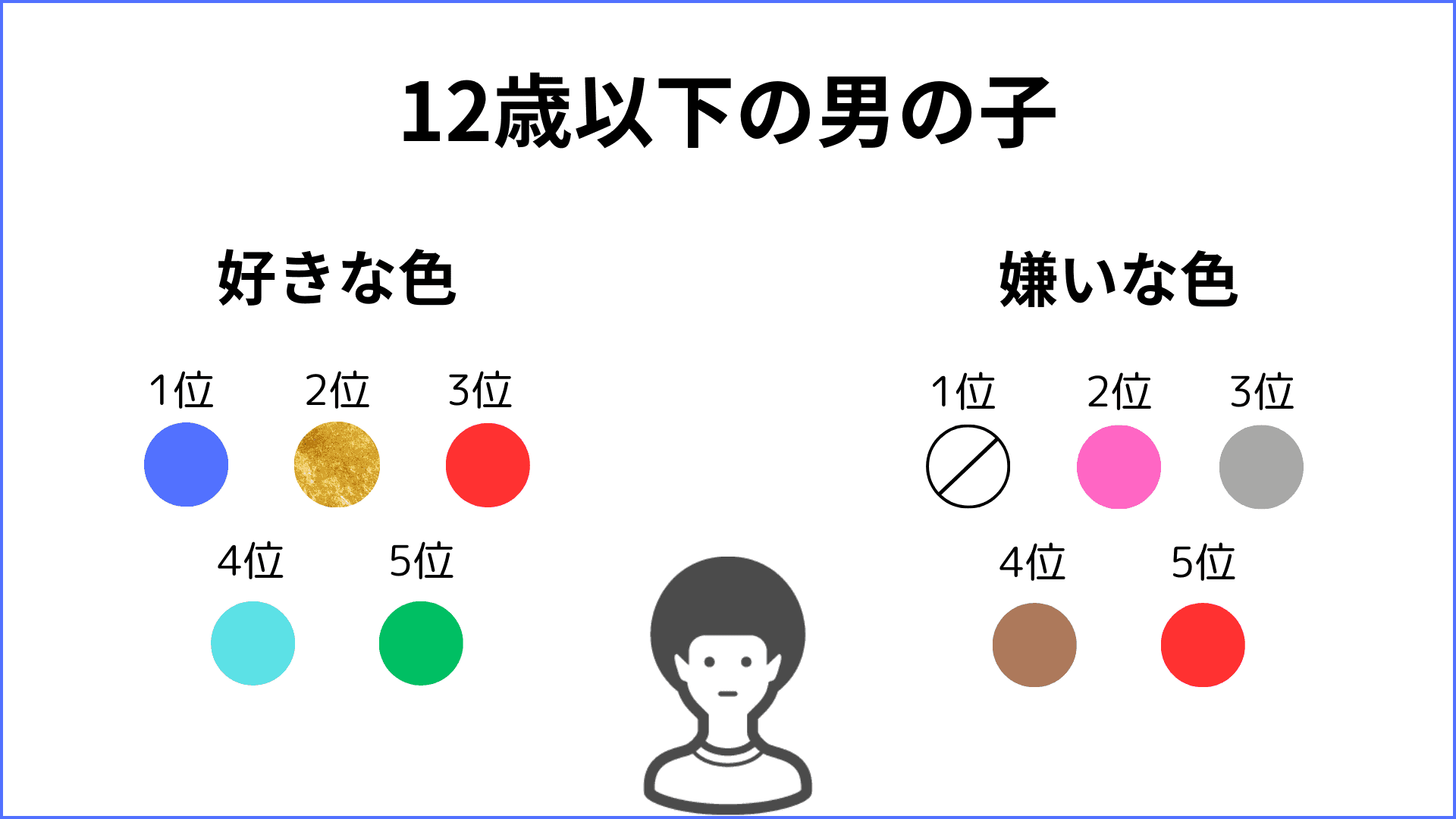 12歳以下の男の子が好きな色と嫌いな色は下記のような結果となっております!