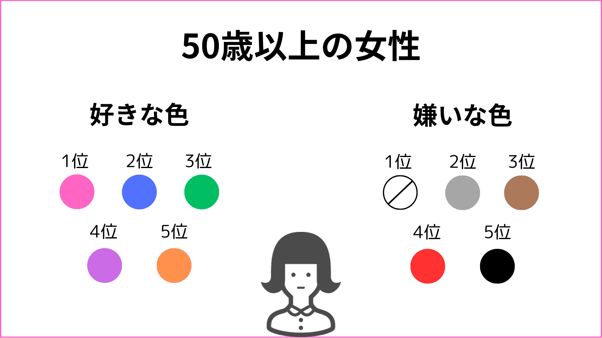 50歳以上の女性が好きな色と嫌いな色は下記のような結果となっております!
