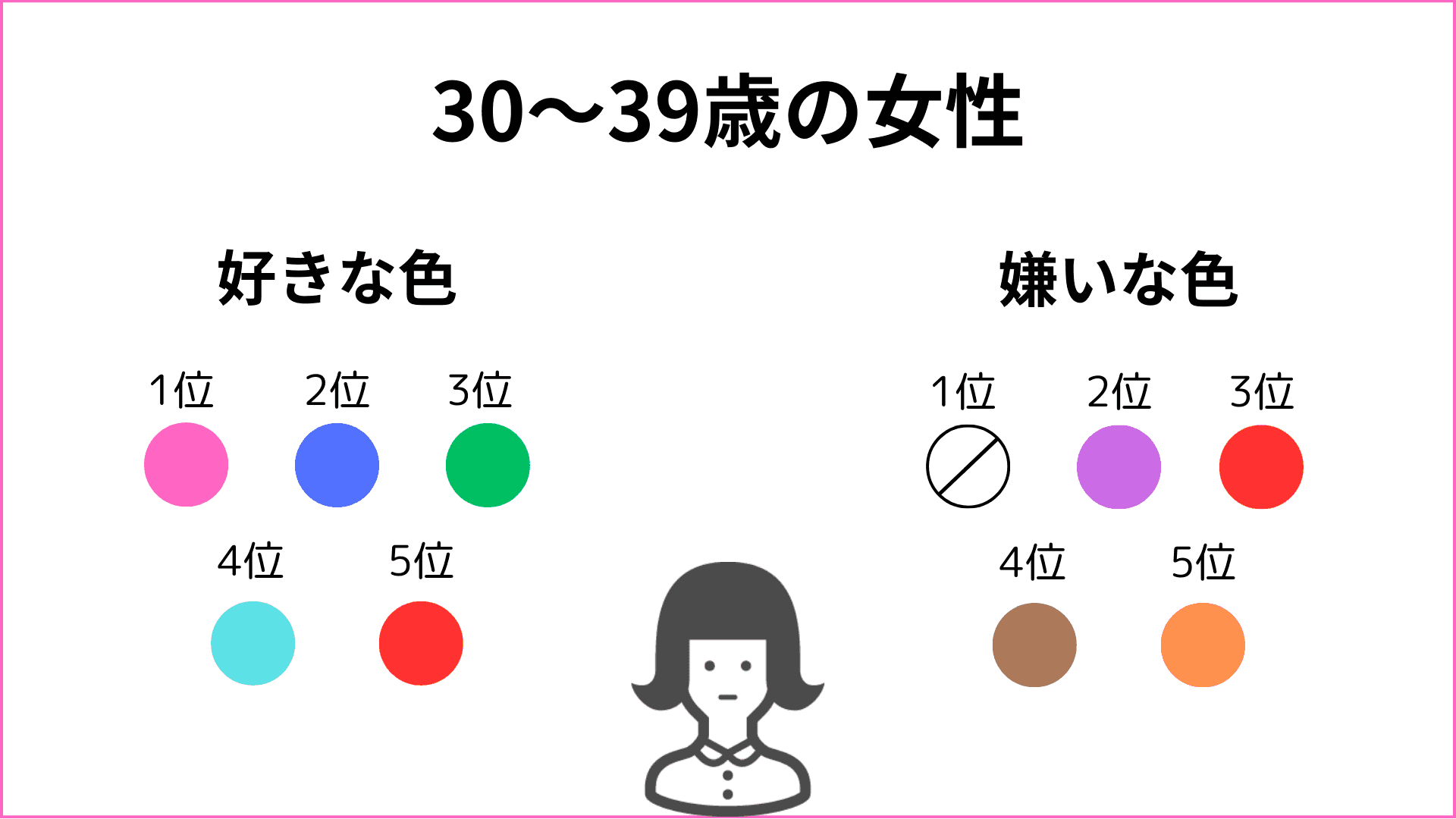30〜39歳の女性が好きな色と嫌いな色は下記のような結果となっております!