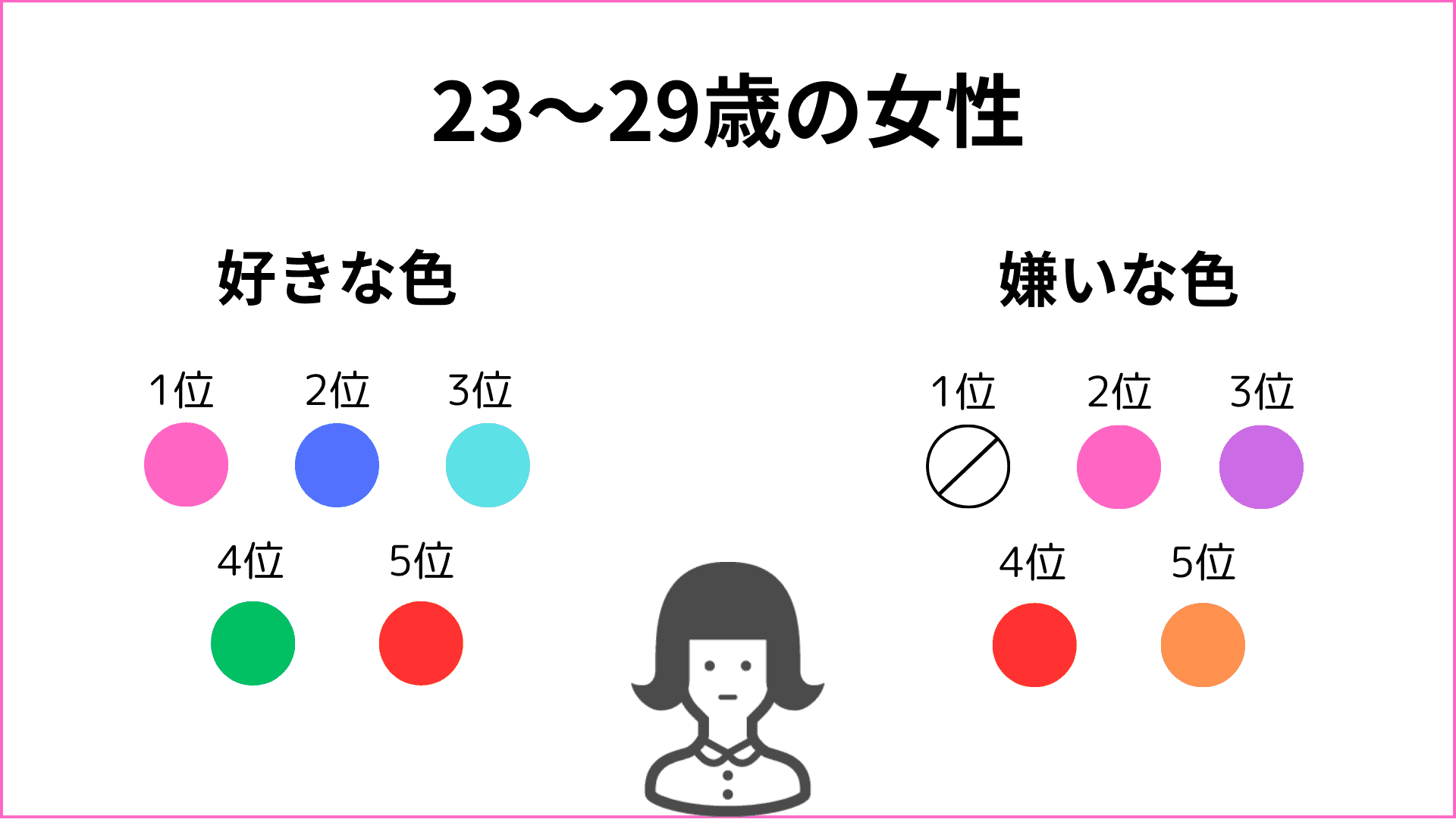 23〜29歳の女性が好きな色と嫌いな色は下記のような結果となっております!