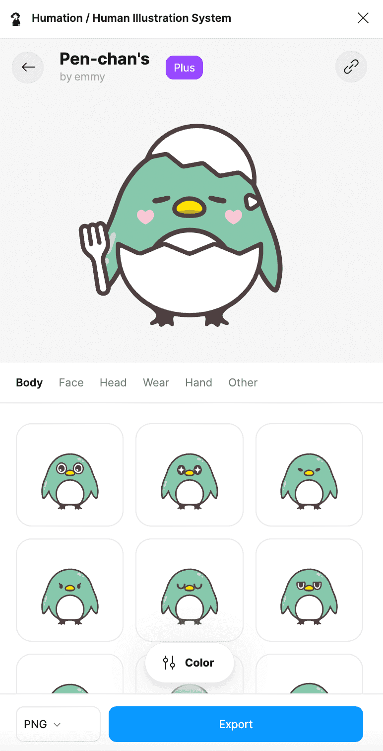 「Head」「Body」「Bottom」を自由に選ぶだけで、簡単にゆる可愛いイラストが生成できます。